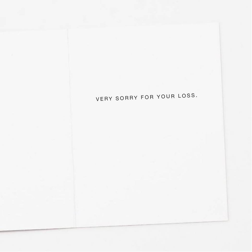 A2 Size Greeting Cards (4.25 x 5.5 inches folded). Inside greeting: "VERY SORRY FOR YOUR LOSS." Printed on premium recycled paper. Paired with recycled white envelopes. Packaged in cello.