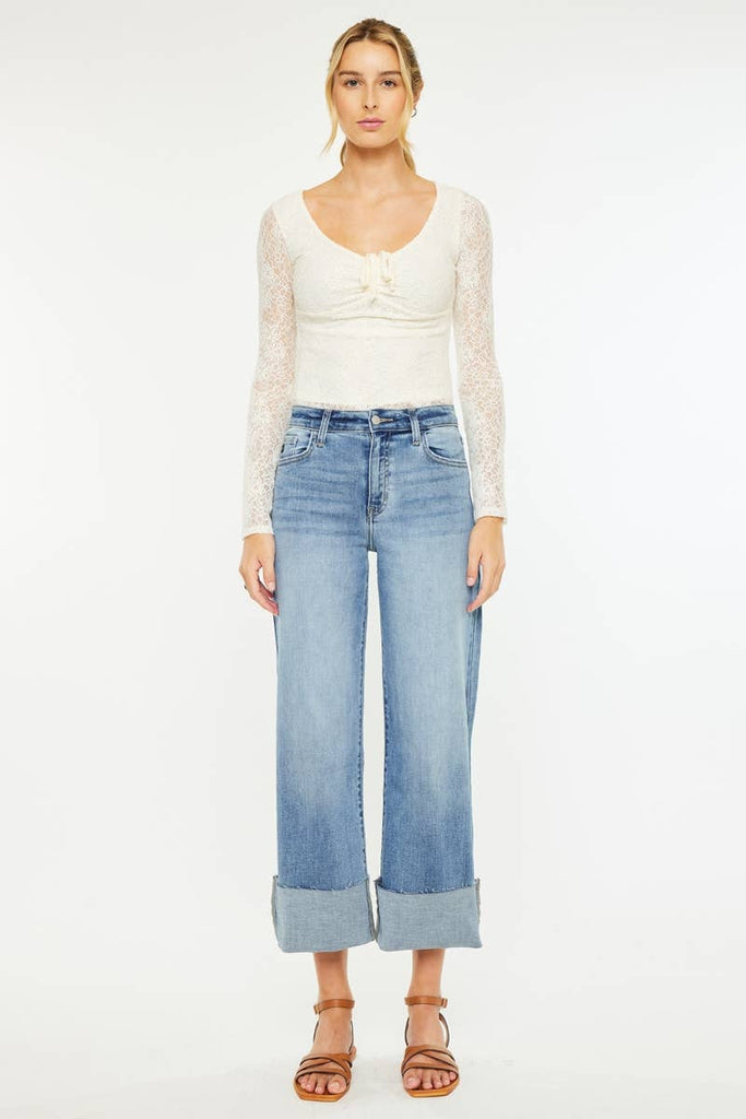 OPEN PACK HIGH RISE CROP WIDE LEG JEANS MEDIUM STONE WASH STRETCH ZIPPER FLY RAW EDGE ANC CUFFED HEM 5 POCKET STYLE RISE 10 1/2" INSEAM 26"(AFTER CUFF) IN SIZE 5/26 92% COTTON, 6% T-400 POLYESTER, 2% SPANDEX 11 OZ KC20082M
