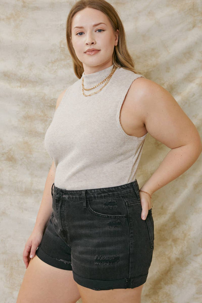 PLUS HIGH RISE FRAYED HEM DISTRESSED DENIM SHORTS 13" RISE, 3.5" INSEAM IN SIZE XL 100% COTTON KC6320BK-P