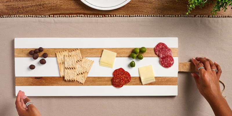 This white long serving board is great for everyday occasions. The long serving board features white-washed and natural mango wood. The serving board features a paddle handle with rope.